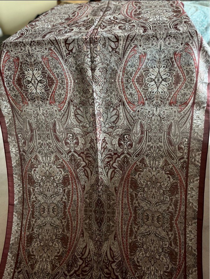 Sentetik kumaştan, bordo ve gri detaylı, bohem tarzda drapeli kadın şalı.