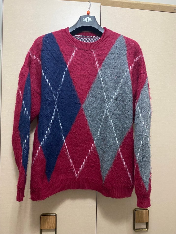 Bordo ve gri büyük baklava desenli, triko dokulu, uzun kollu, rahat kesim kadın kazak. Günlük sokak stiline uygun.
