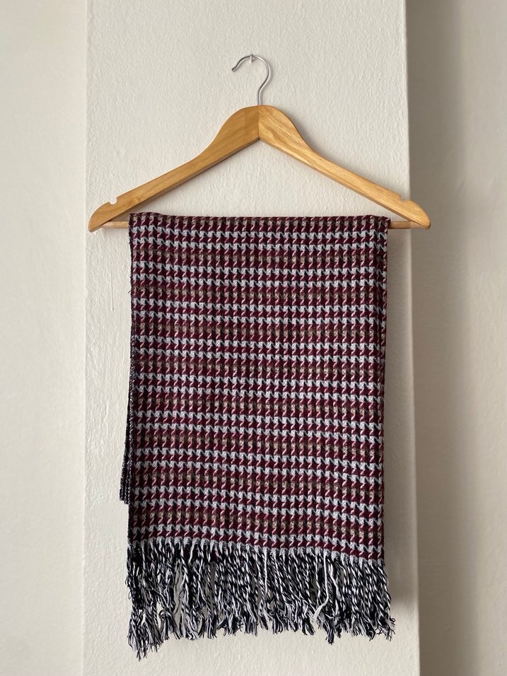 Bordo ve gri tonlarda, desenli, uçları püsküllü şal.