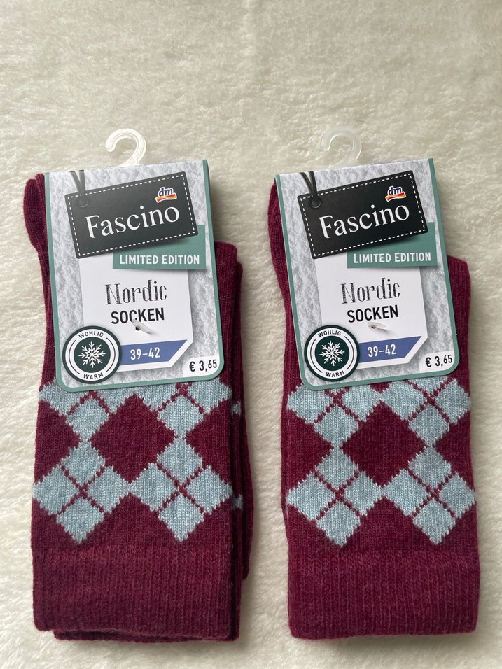 Fascino markalı bordo yün çorap, gri baskılı elmas desenli, Nordic tarzında. Sınırlı sayıda, 39-42 numara.