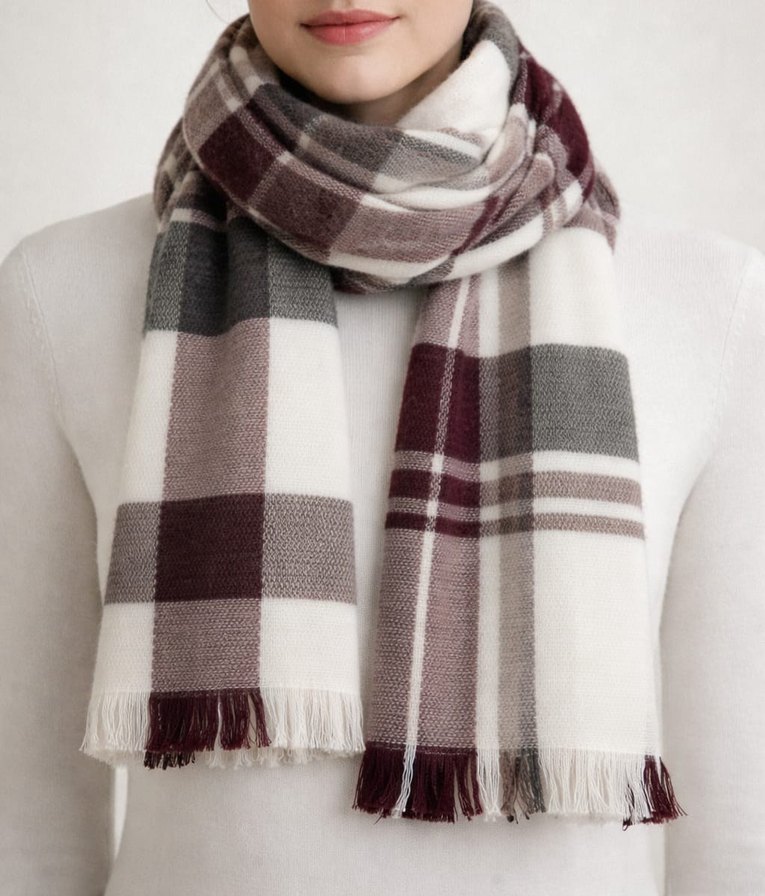 Bordo ve gri ekose desenli, dökümlü kadın şalı. Yumuşak akrilik kumaştan, rahat ve bohem tarzda günlük kullanım için uygundur.