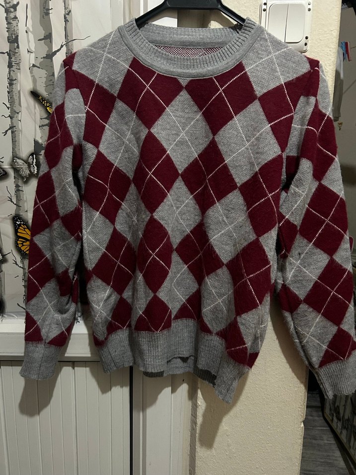 Bordo ve gri ekose desenli, uzun kollu, yuvarlak yaka ve bol kesim örgü kadın kazak. Rahat ve şık sokak stiline uygun.