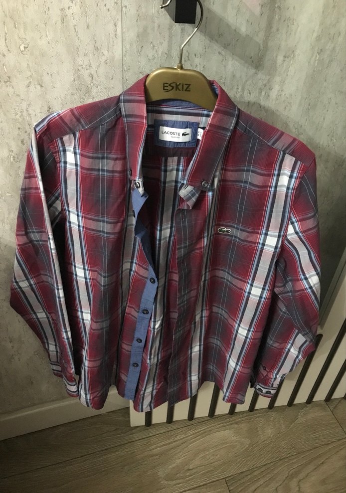 Bordo ve gri ekose desenli, uzun kollu, çıtçıtlı, normal boyda bol kesim erkek gömleği. Notlu yakalı, günlük sokak stiline uygun. Askıda 'ESKIZ' yazıyor.