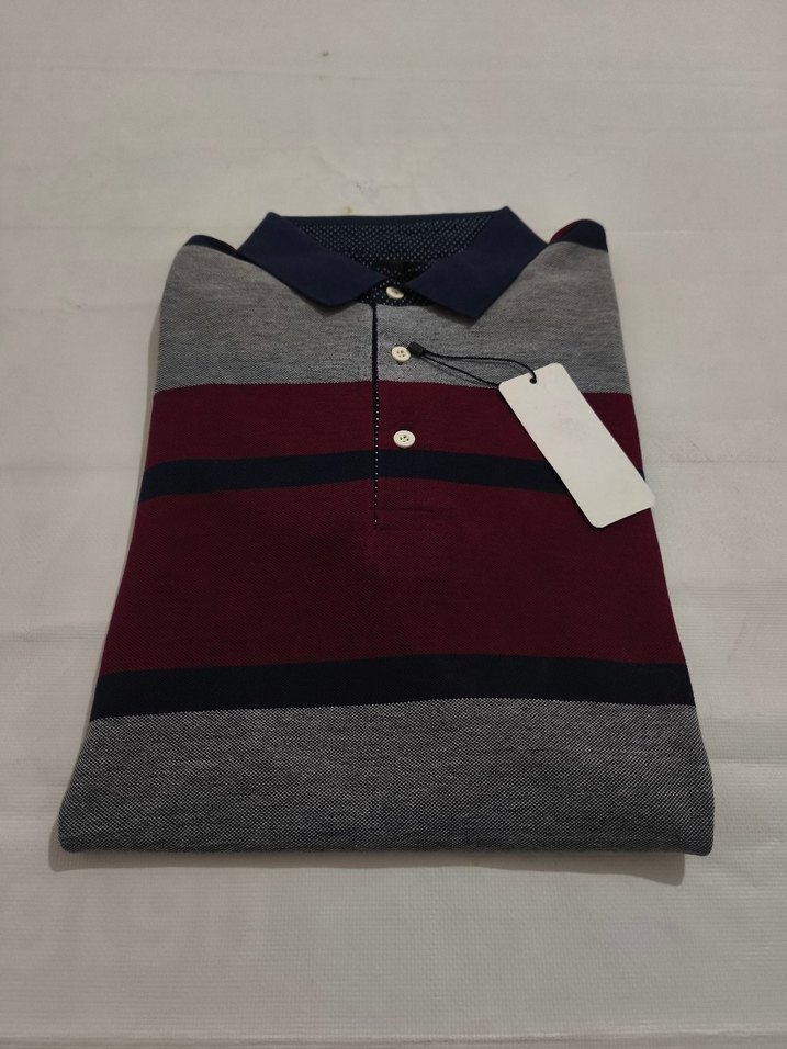 Erkekler için kısa kollu, yakalı polo tişört. Bordo ve gri renklerde, çizgili desenli ve örme kumaştan üretilmiştir. Günlük rahat kullanım için uygundur.