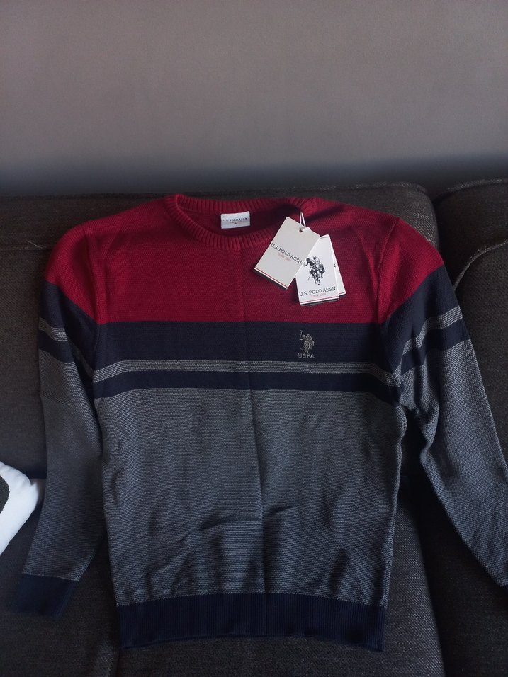 Bordo ve gri renk bloklu, uzun kollu, bisiklet yaka, ince kesim örgü erkek triko kazak.S beden orjinal polo