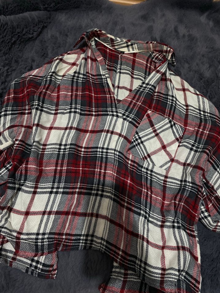 Bordo ve gri kareli, düğmeli, uzun kollu, yakalı, bol kesim kadın gömleği. Normal boyda, rahat ve trend günlük stil için uygun.