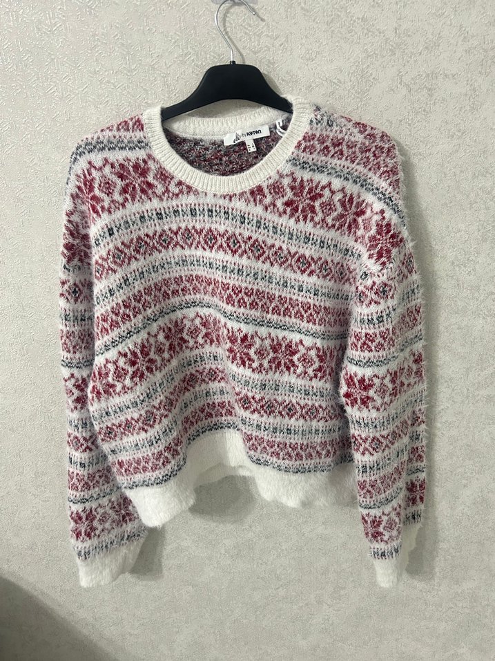 Bordo ve gri nakışlı, bohem tarzda, uzun kollu ve yuvarlak yaka rahat kesim kadın kazak.