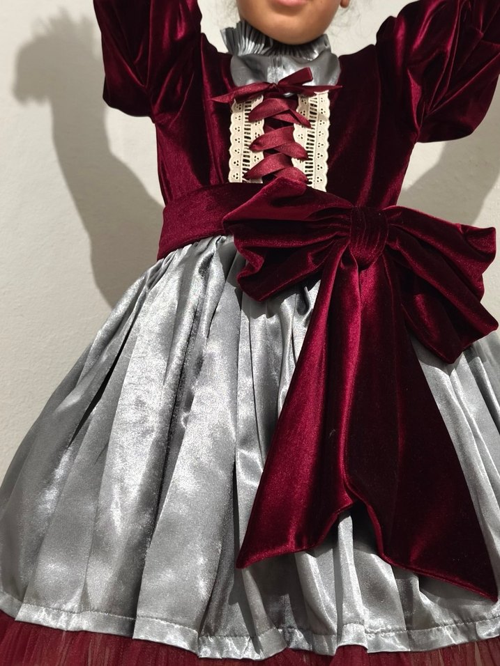 Bordo gövdesi nakışlı ve yüksek yakalı, gri etek yumuşak ve parlak dokulu, fırfır ve büyük bordro fiyonk detaylı, klasik gotik şıklık sunar.Özel dikim