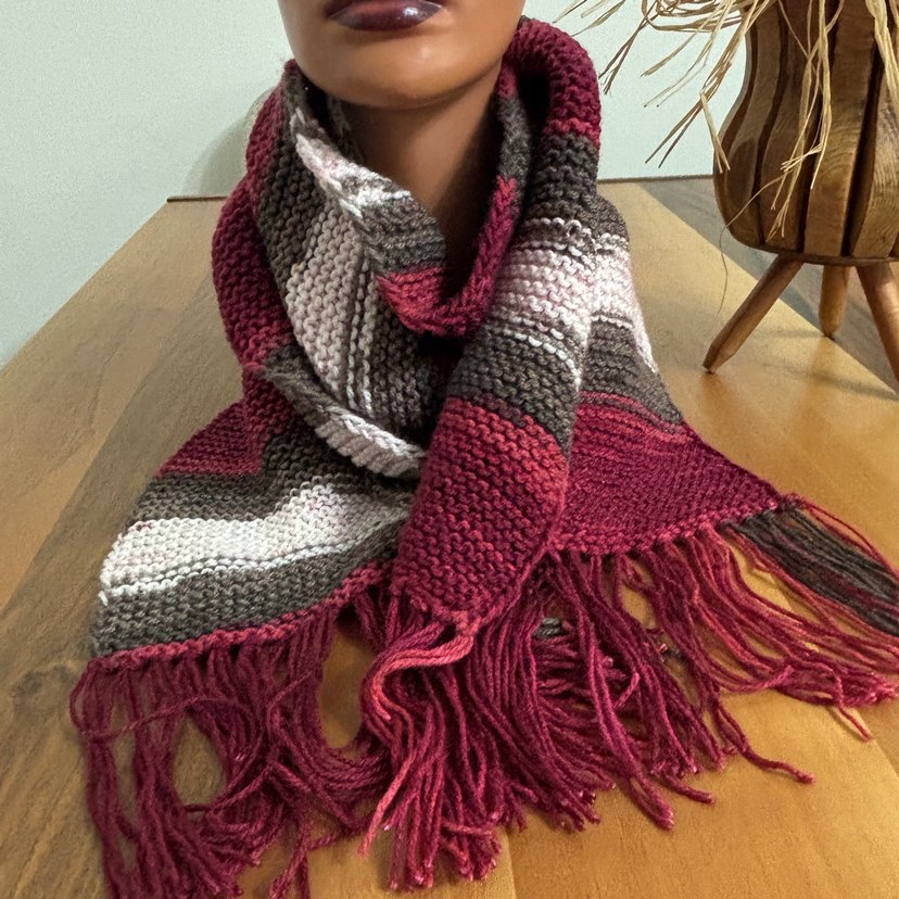 Bordo ve gri çizgili, püsküllü, örgü yapıda bohem tarzda kadın şalı. Retro ve hippie görünüm için ideal. Atkı