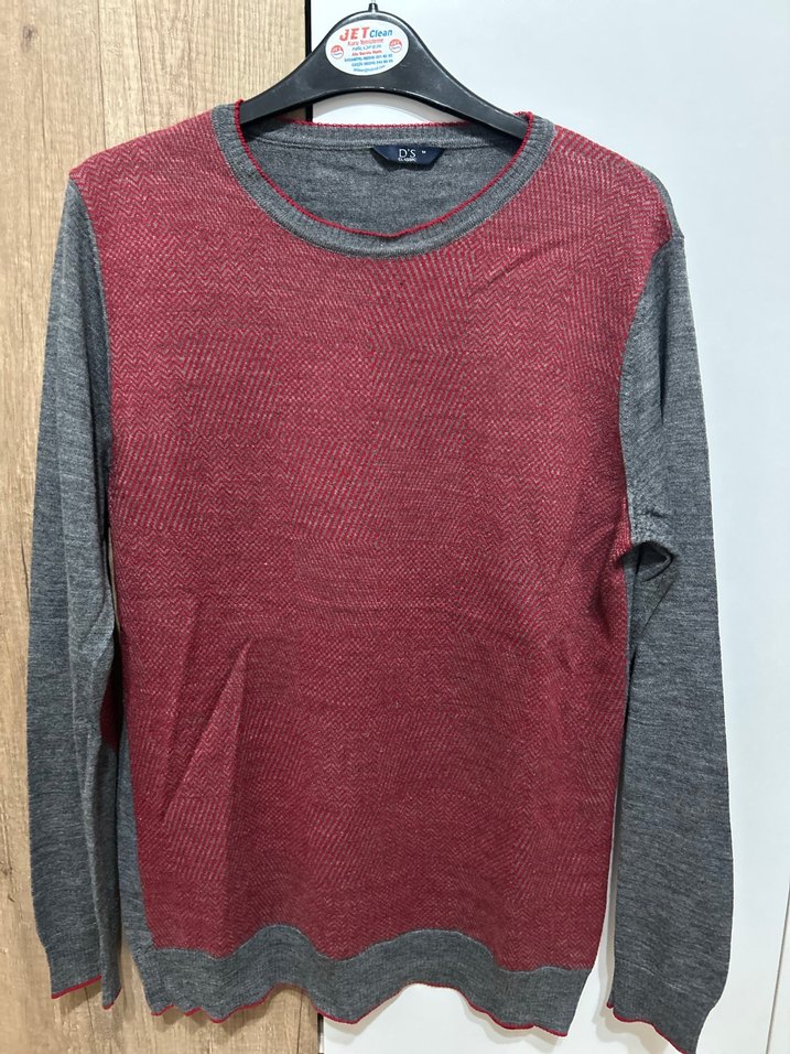 Örgü yün kumaştan, bordo ve gri renklerde, yuvarlak yaka ve uzun kollu, salaş kesim erkek triko kazak. Günlük kullanıma uygun sokak tarzı. Görseldeki gibi bir defosu mevcut