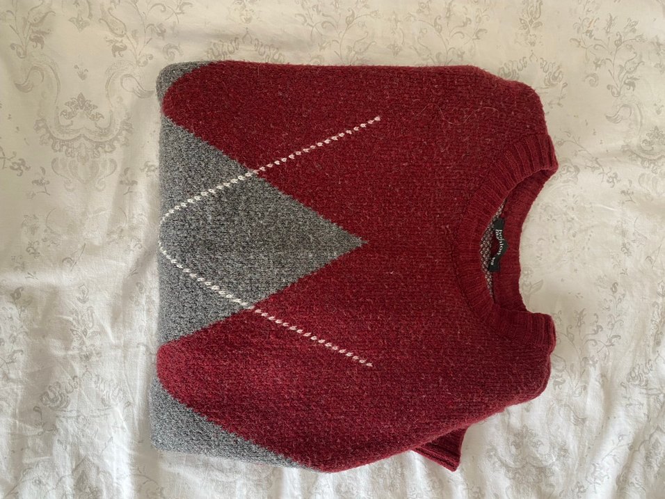 Bordo ve gri tonlarda, yumuşak örgü kumaştan yapılmış, bisiklet yaka ve uzun kollu, vücuda oturan kadın kazak. Günlük kullanıma uygun rahat bohem tarzda.