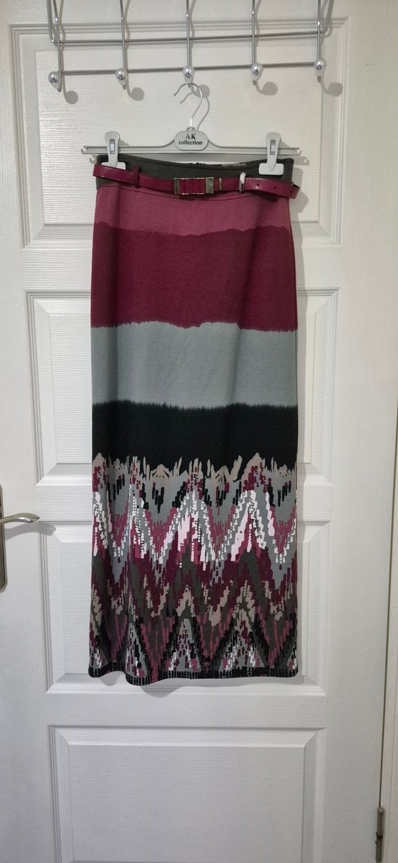Bordo ve gri tonlarında batik desenli, örgü dokulu uzun etek. Bol kesimli, bohem tarzda, günlük kullanıma uygun.