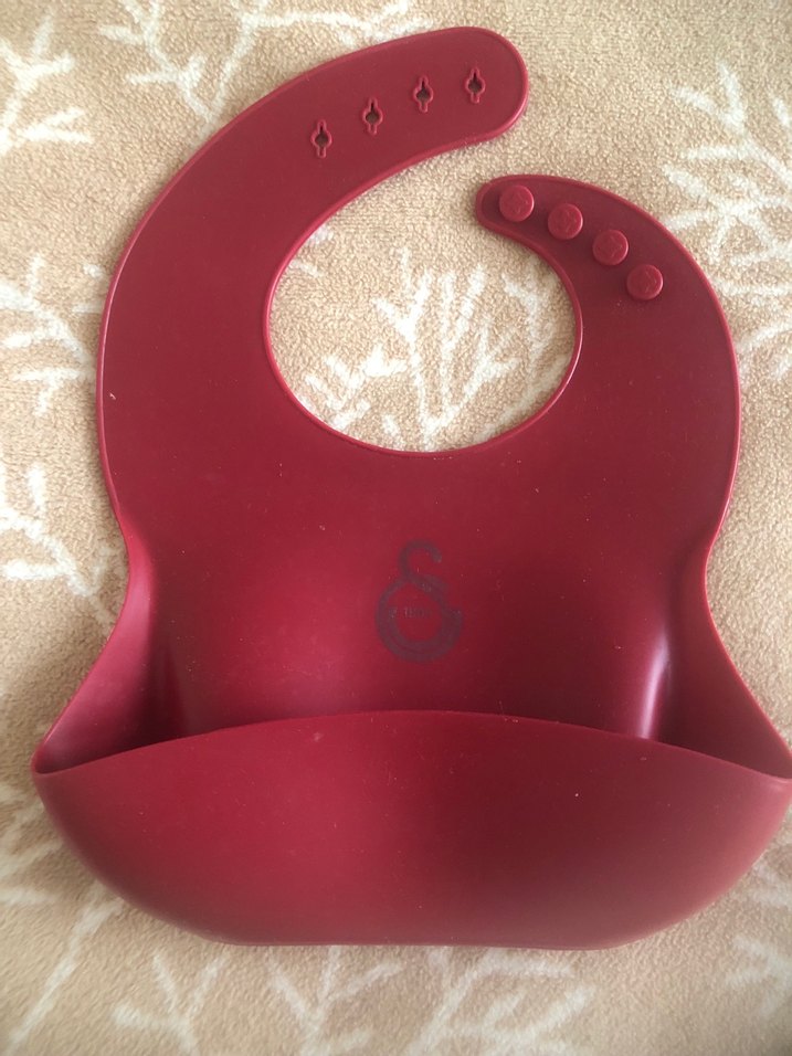 Bordo parlak baskılı bebek önlüğü, ayarlanabilir çıtçıt düğmelerle rahat kullanım sağlar. Orijinal ürün