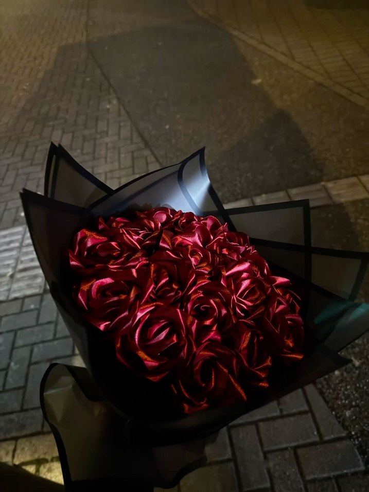 Siyah şeffaf kağıda sarılı koyu bordo gül buketi, özel anlar için uygun.