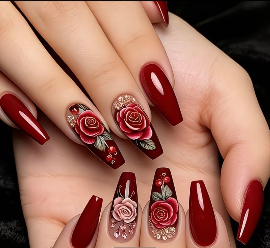 Detaylı gül desenleri ve zarif aksesuarlarla süslenmiş koyu bordo tırnaklar Jel yapıştırıcı ve törpü ile birlikte gönderilecektir.