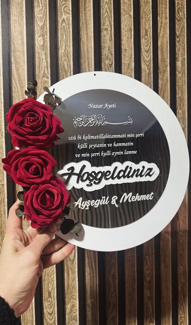 Bordo renkli, Nazar Ayeti ve kişiye özel isimlerin yer aldığı dairesel kapı süsü. Gerçekçi bordro güller ve hoşgeldiniz yazısı içerir.