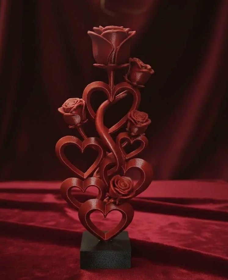Bordo renginde, gül ve kalp figürleriyle süslenmiş dekoratif vazo, siyah kaide üzerinde duruyor.