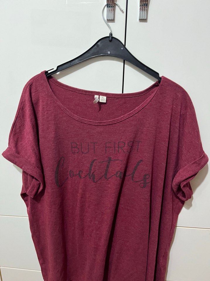 Bordo renkli, kısa kollu, düğmeli hamile tişörtü. Pamuklu ve rahat kesim, baskılı desenli, romantik akşamlar için uygun.