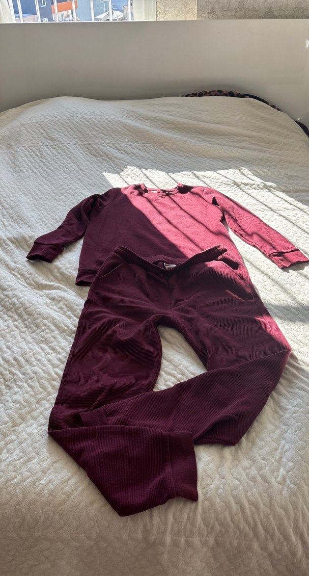 Bordo renk, uzun kollu, yuvarlak yakalı, bol kesim hamile ve emzirme pijama takımı. Üst ve midi boy pantolon içerir, rahatlık sağlar.
