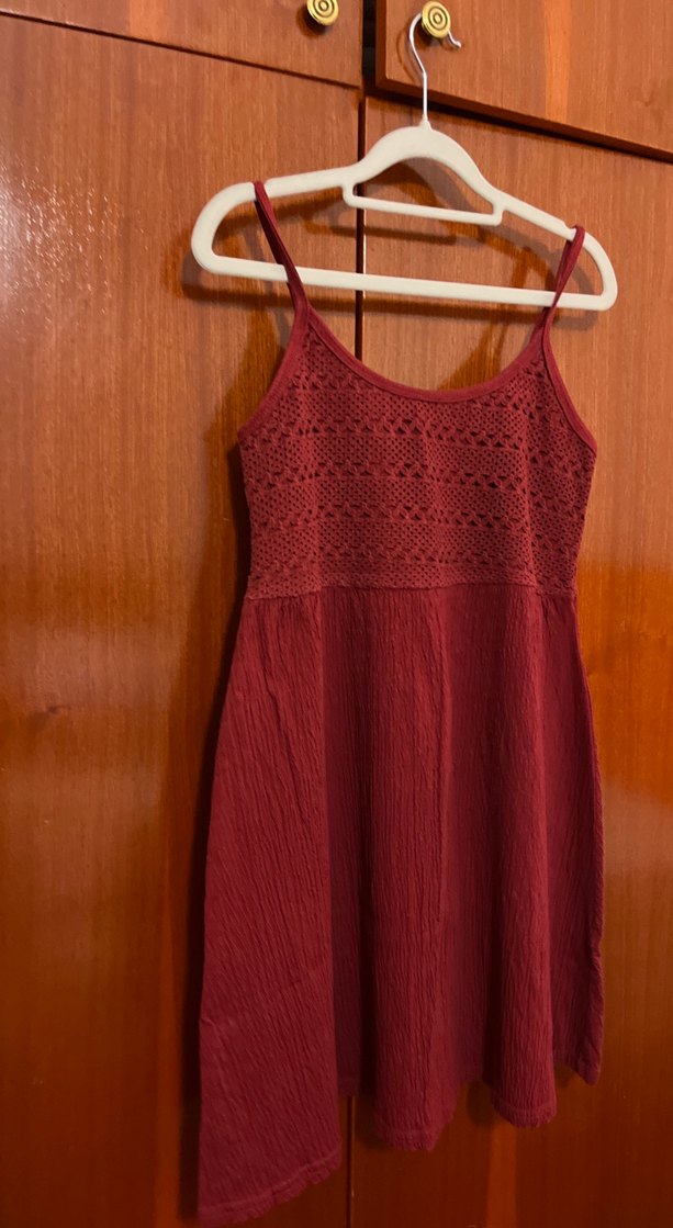 Bordo renk, ince askılı, dantel detaylı triko üst kısmı ve düz etek kısmıyla bohem tarzda midi boy elbise. V yaka ve dar kesim özellikleri bulunur. Çok şık az kullanılmış M beden