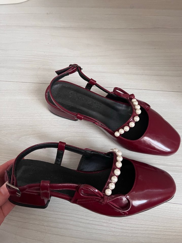 Bordo parlak, tokalı, inci detaylı blok topuklu kadın ayakkabısı. Modern klasik stilde, romantik akşamlar için uygun şık tasarım.