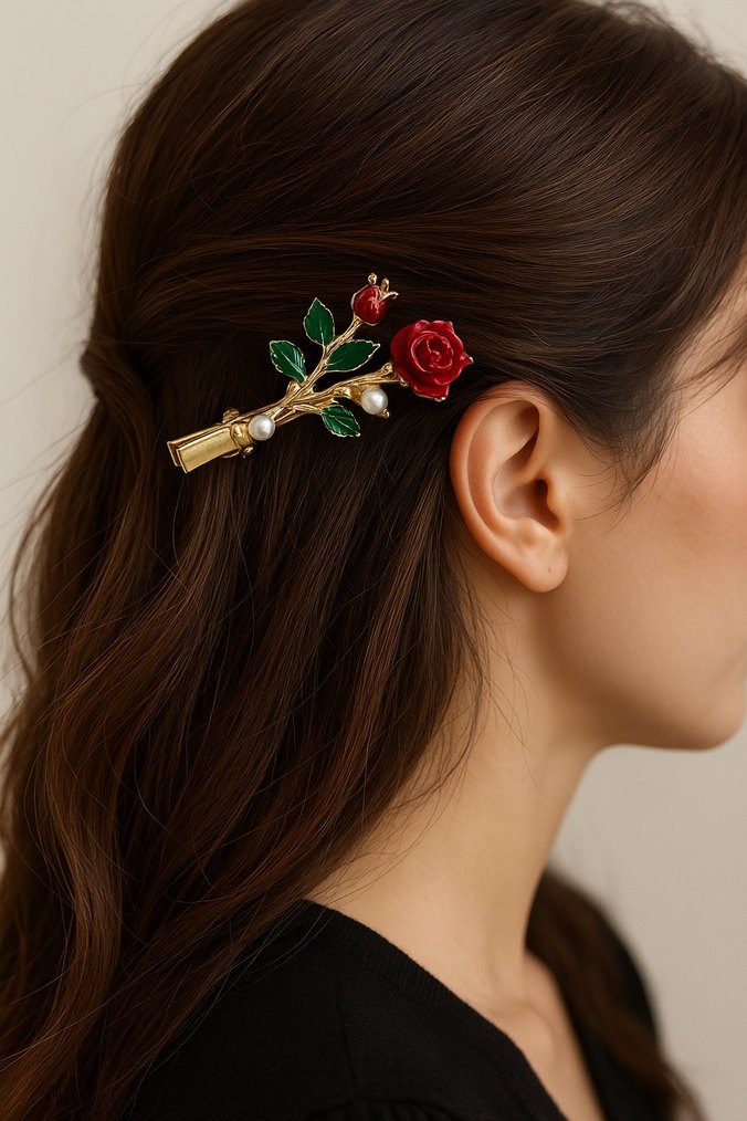1 adet 80₺ 2 adet 140₺ Bordo renkli, ipeksi dokulu saç tokası, boncuklu kırmızı gül ve yeşil yaprak detaylarıyla bohem bir şıklık sunar.