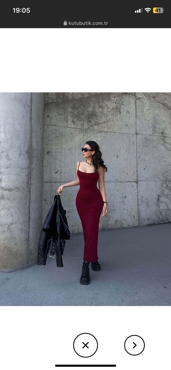 Bordo , uzun ve ip askılı, straplez kesimli, vücuda oturan elbise. Rahat ve şık sokak stili için ideal.
