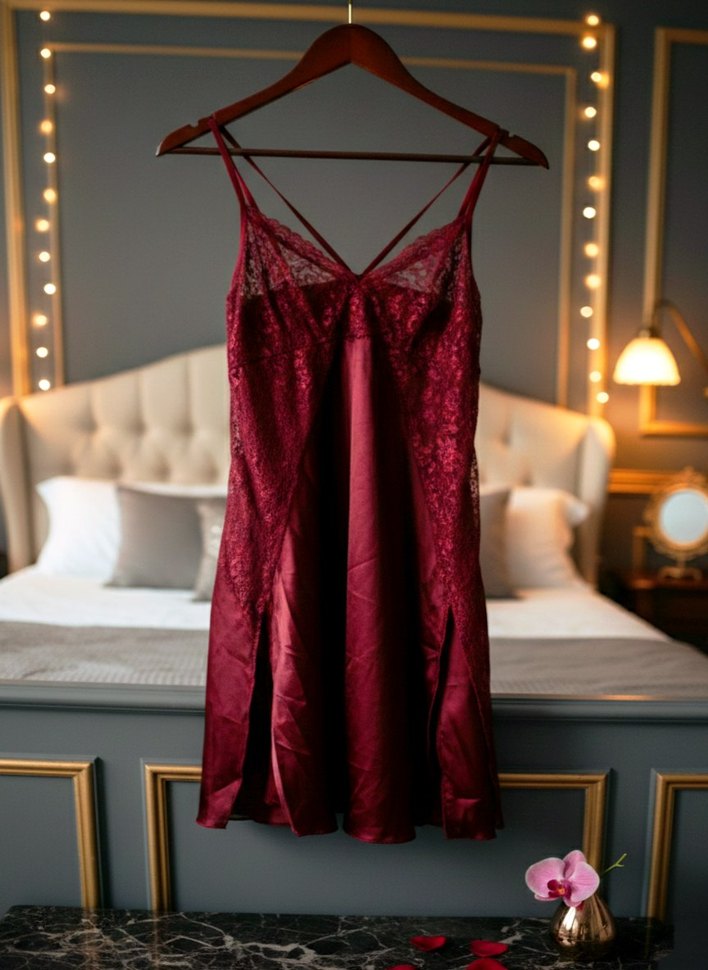 Bordo renkli, ip askılı, dantel detayaylı gecelik
