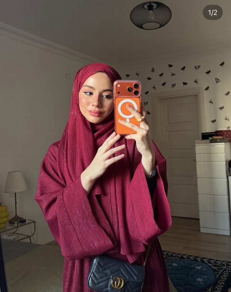 Bordo renkte, ipek dokulu kumaştan yapılmış, bohem tarzda drapeli kadın şalı. Ve abaya