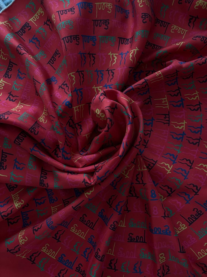 Bordo renkte, ipek görünümlü ve drapeli tasarıma sahip bu fular, canlı pop kültürü desenleriyle bohem tarzını yansıtıyor.