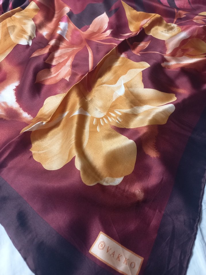 Bordo renkli, ipek görünümlü kumaştan yapılmış, büyük çiçek desenlerine sahip, bohem tarzda şık bir kadın fularıdır. Üzerinde @VAKKo etiketi bulunur.