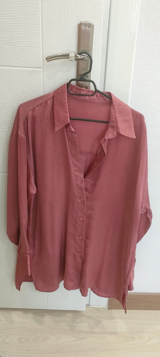 Bordo parlak renkte, düğmeli önü ve yakalı, ipek görünümlü kumaştan yapılmış bol kesim kadın gömlek. Ofis kullanımı için uygun. sayılı kullanıldı temizdir
