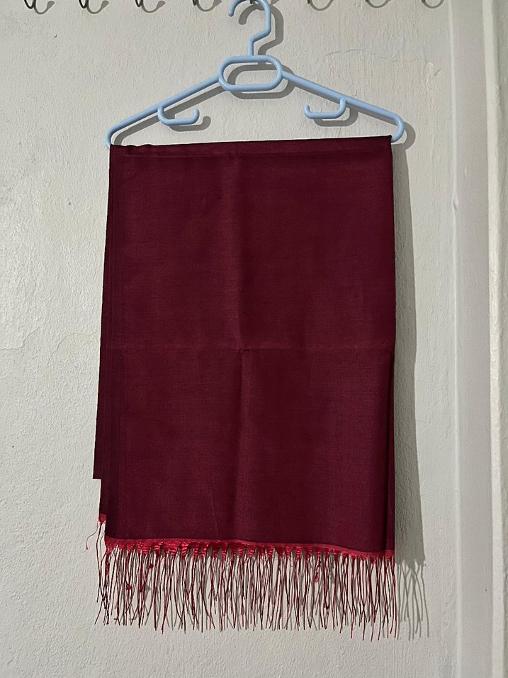Bordo renkli, ipek görünümlü kadın şal, drapeli tasarımı ve ince püskülleriyle bohem tarzını yansıtıyor. Minimalist ve retro kombinlere uygun.