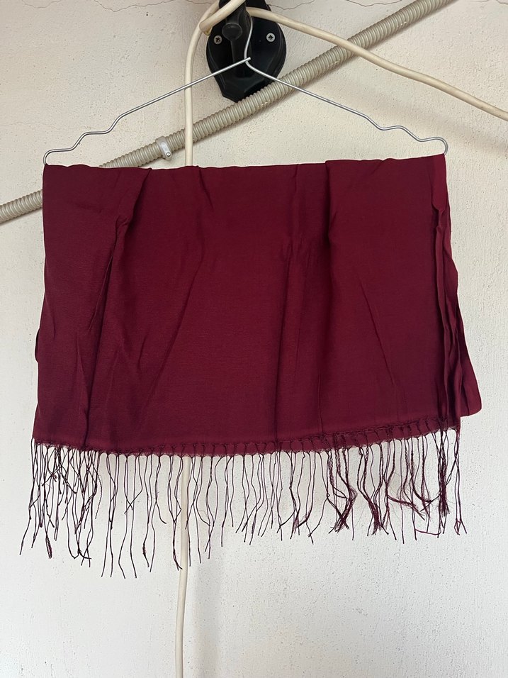 Kadınlar için bordo renkte, ipek görünümlü, püsküllü uçlara sahip drapeli şal. Bohem ve retro tarzlarla uyumludur. Hiç kullanılmadı. Sorunsuz