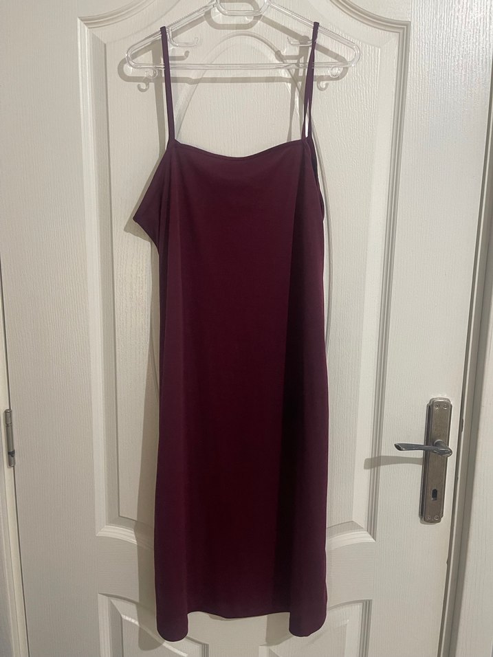 Bordo renkli, askılı tasarıma sahip, ipek görünümlü kumaştan midi boy elbise, romantik akşamlar için uygun.