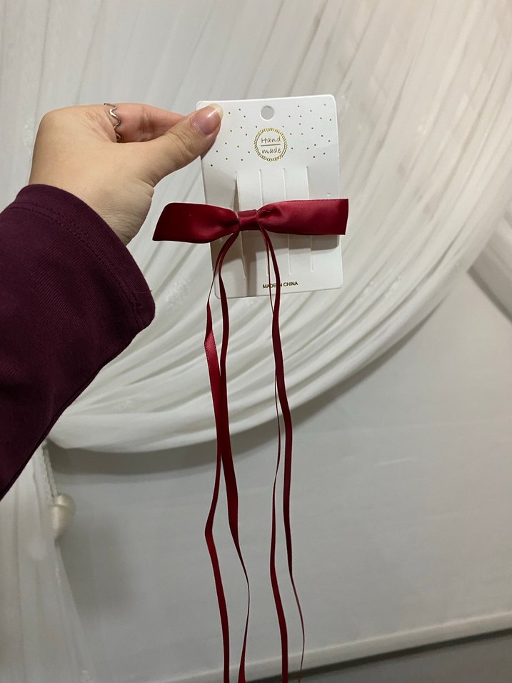 Uzun kuyruklu, parlak bordo ipeksi kurdele şeklinde, sade ve temel bohem tarzda kadın saç aksesuarı.