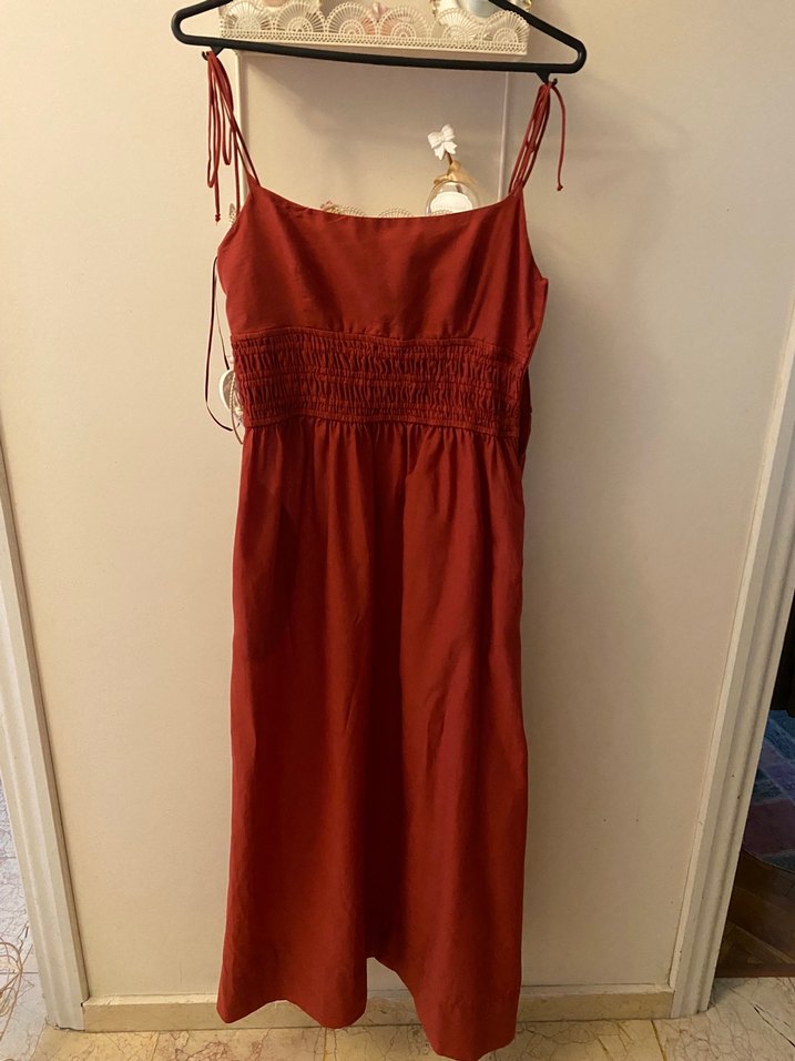 İnce askılı, straplez yakalı ve drapeli uzun, fit kesim bordo keten elbise. Bohem tarzı ve parlak dokusuyla romantik akşamlara uygun.