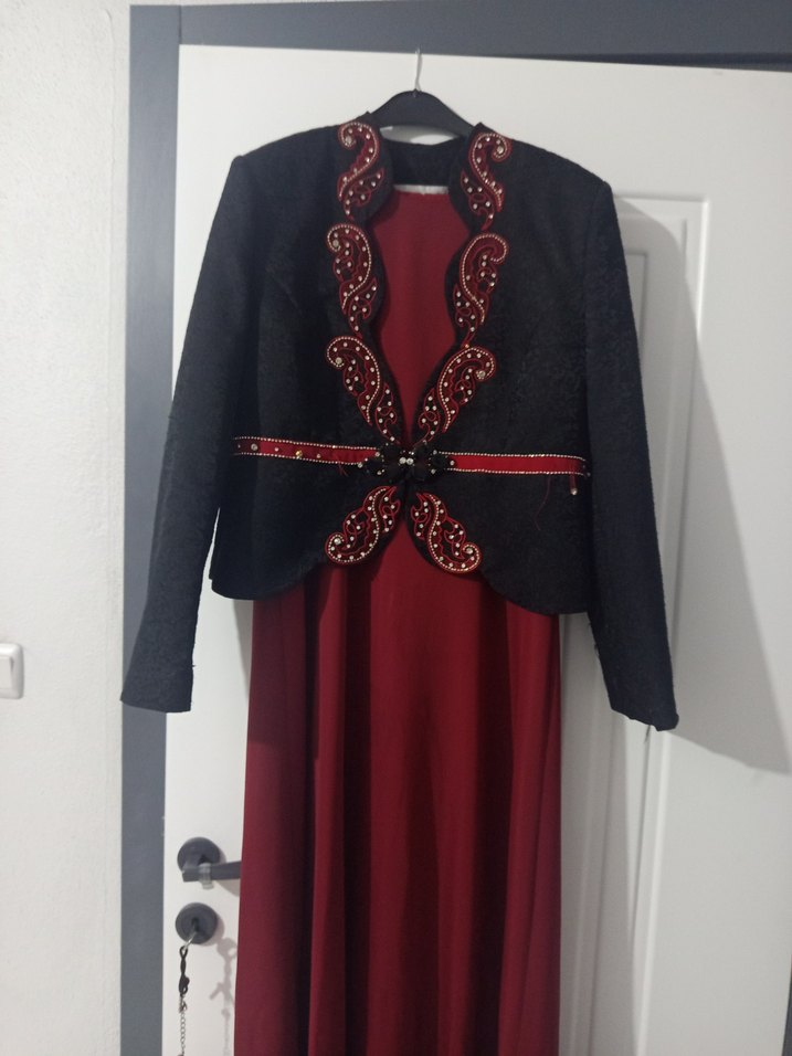 Bordo uzun etek ve boncuk işlemeli siyah ceketli, klasik kesim, uzun kollu kadın abiye elbise. Düğün ve gotik tarzlar için uygundur.
