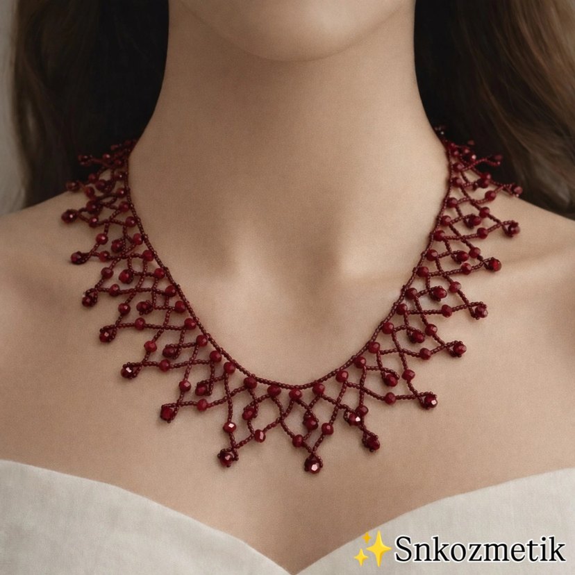 Bordo boncuklu kolye, işlemeli deseni ve parlak görünümüyle bohem ve göz alıcı, günlük kullanıma uygun. ✨