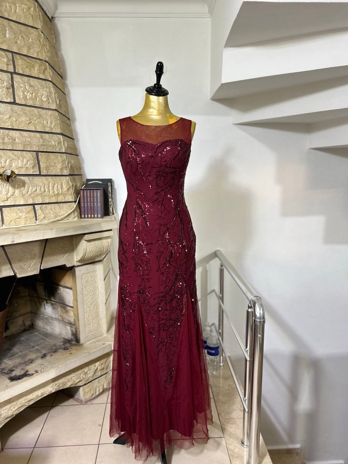 Bordo renkli, kolsuz, yuvarlak yakalı ve boncuk işlemeli uzun abiye elbise. Düğünler için uygun, klasik ve modern kesimli, normal kalıplı. 34-36-38 bedenler için uygundur.