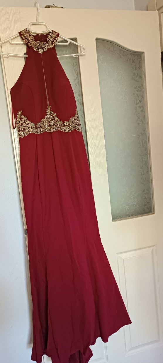 Bordo renkli, straplez ve kolsuz, işlemeli detaylı, drapeli ve vücuda oturan uzun abiye elbisedir. Düğünler için uygundur. ✨