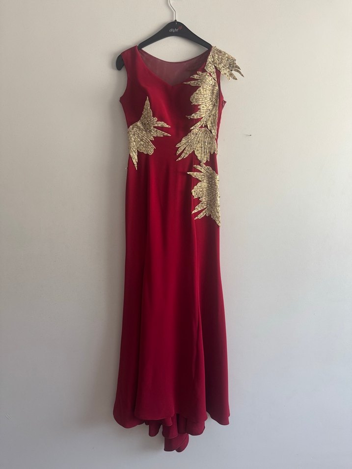 Bordo renkli, drapeli ve işlemeli detaylara sahip uzun, kolsuz, V yakalı, vücuda oturan abiye elbise. Düğün için uygundur.