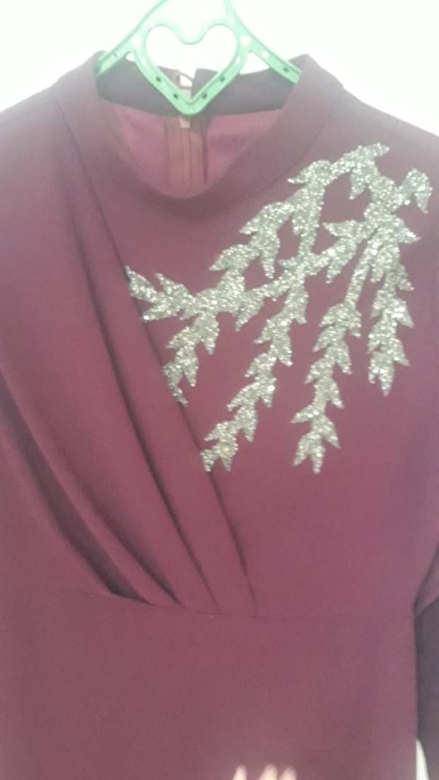 Bordo renkli, yüksek yakalı ve uzun kollu, drapeli ve parlak işlemeli detaylara sahip, modern klasik kesim abiye elbise.rengi goeundugunden daha canlı yalnizca 1kez giyildi harika krep kumaş