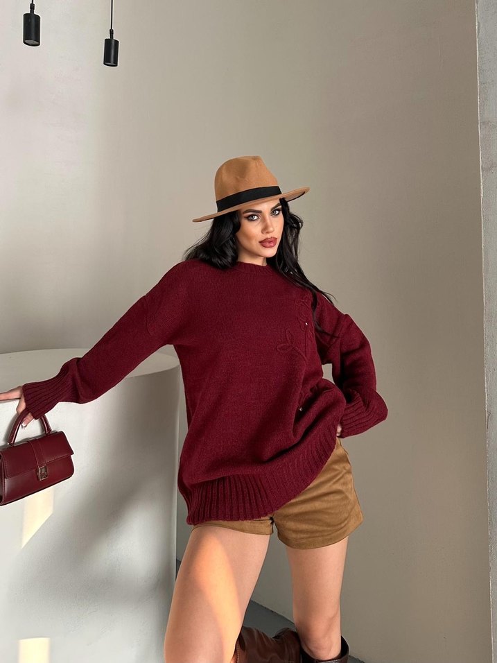 Bordo renkli, örgü dokulu, uzun ve bol kesim kadın kazak. Uzun kollu ve bisiklet yaka tasarımıyla rahat bir kullanım sunar. Yumuşak dokulu ve günlük kullanıma uygundur.