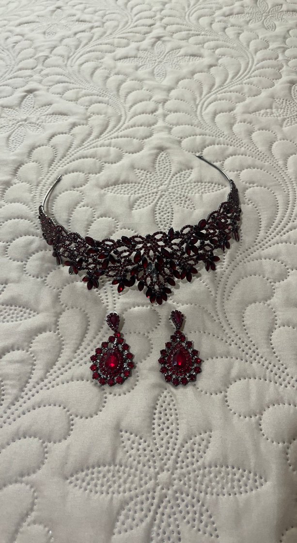 Bordo işlemeli, boncuk detaylı takı seti. Kolye ve küpe uyumlu, düğünler için uygun, gotik ve şık tarzda.