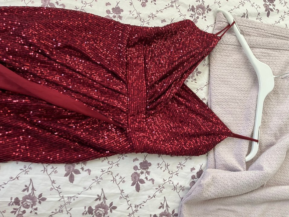 Bordo renkli, işlemeli ve ince askılı midi abiye, rahat ve şık düğün davet modasına uygun bir tasarıma sahiptir.