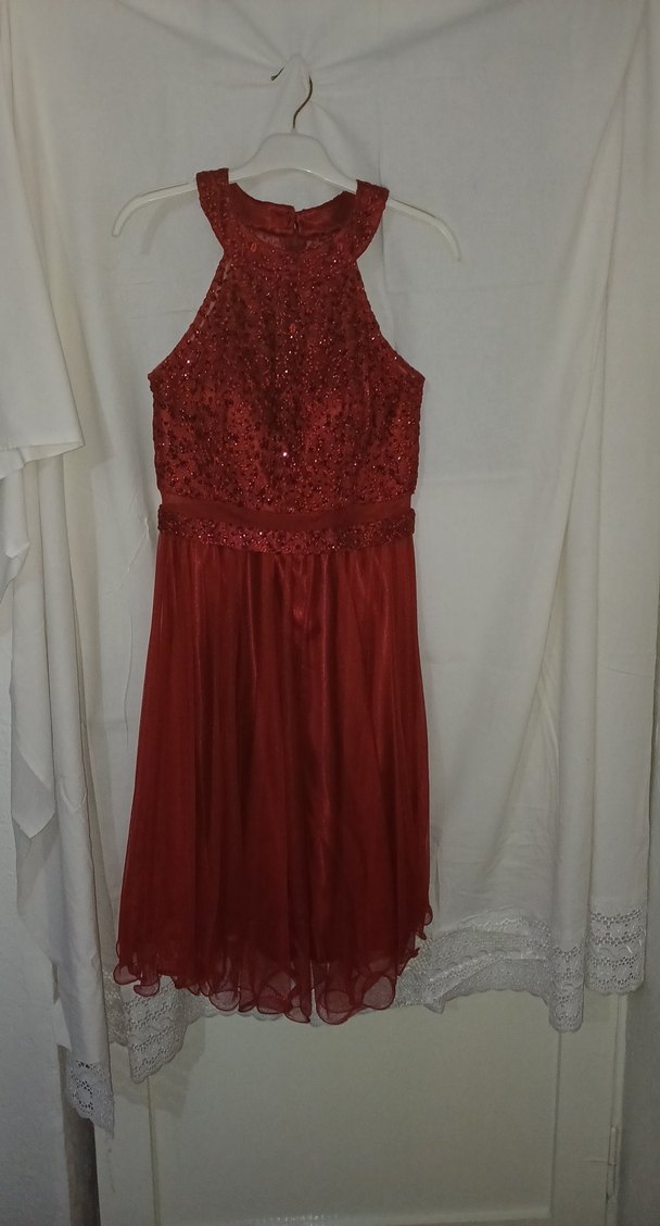 Bordo renk, yüksek yakalı ve kolsuz, işlemeli, astarlı ve drapeli detaylara sahip, klasik kesim midi abiye elbise.