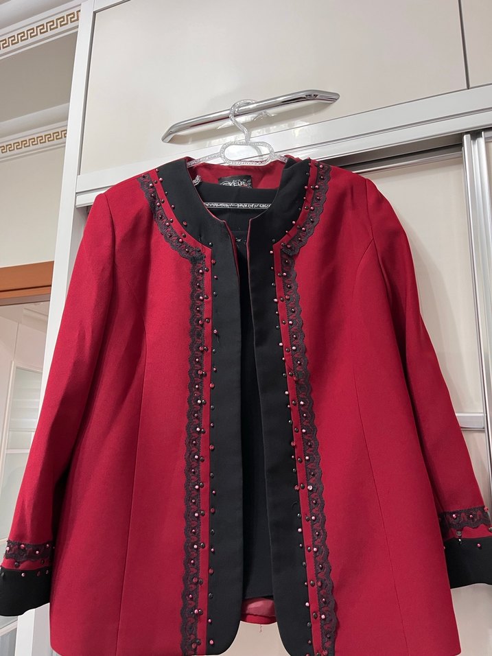 Bordo renkli, uzun kollu, düğmeli ve işlemeli detaylara sahip midi ceket Ofis için uygun, normal kesim ve klasik tarzda, sentetik kumaştan üretilmiştir.