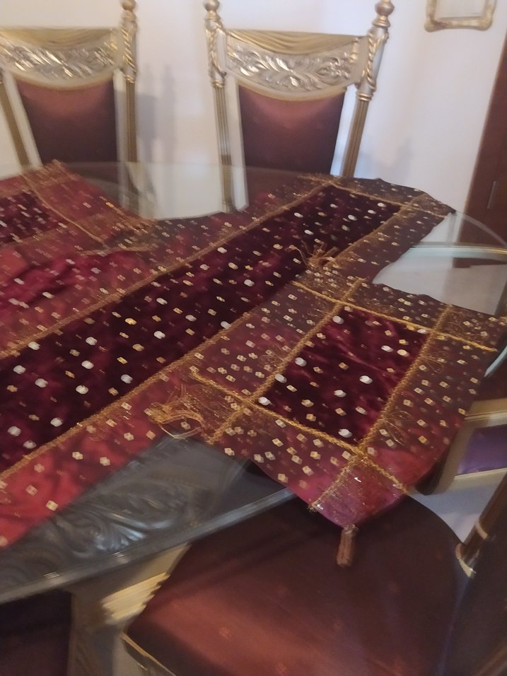 Bordo renkli, parlak kumaştan yapılmış, işlemeli desenlere sahip masa örtüsü. ️el yapımı salon takımı kadıfe ve tafta karışımı çok şık takım