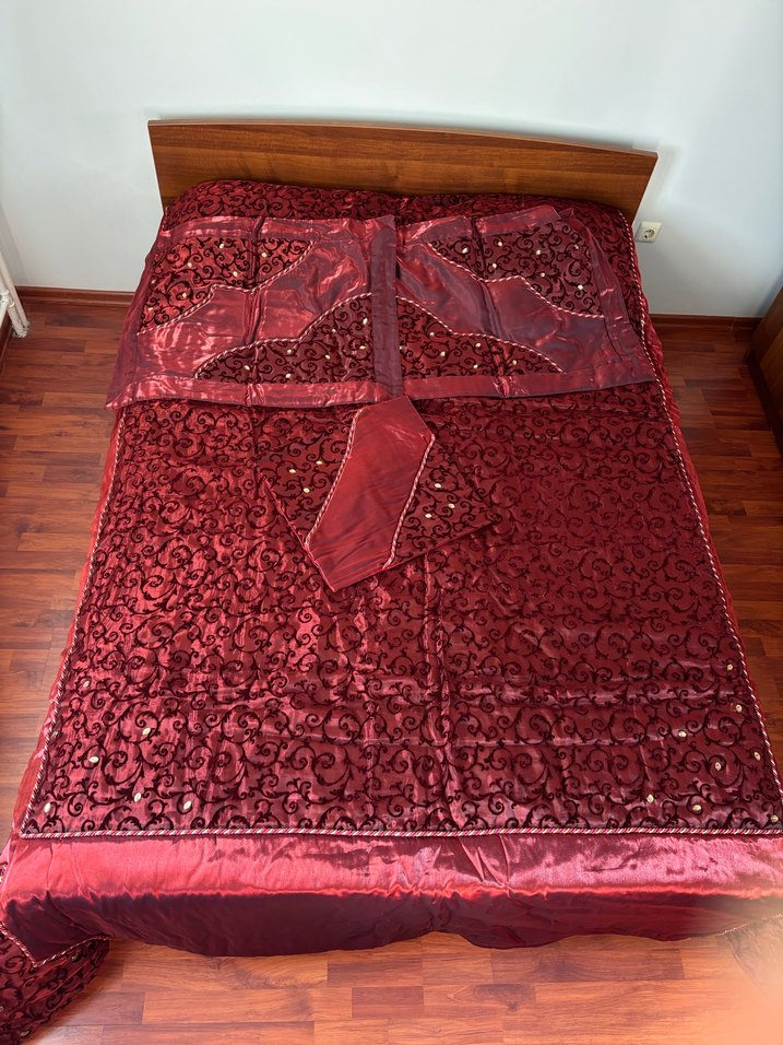 Parlak bordo renkte, işlemeli desenlere sahip yatak örtüsü. Taşları ve işlemeleri mevcut. Hiç kullanılmadı, etiketi üzerindedir. Taşıma hurcuyla birlikte verilecektir.